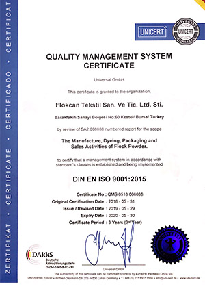 ISO 9001 kalite belgesi için çalışmalarımız 15.05.2009 tarihi itibari ile İSO 9001 : 2008 gerekliliklerine göre “ Flok Tozu İmalatı ve Satışı “ için tetkik edilerek SGS tarafından belgelendirilmiştir.